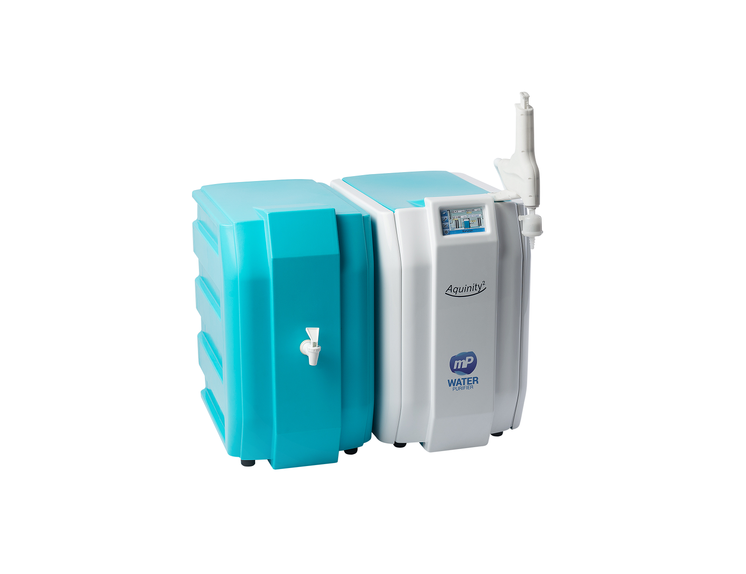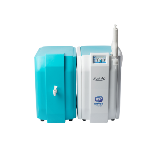 L’Aquinity² P produit de l’eau déionisée ( 1 MOhm x cm) grâce à l’osmose inverse et un module de conditionnement vers un réservoir externe (35 ou 70 litres). L’eau peut être utilisée directement pour le nettoyage de verrerie ou connectée à un lave-vaisselle de laboratoire. L’eau ultrapure est ensuite produite à partir du réservoir et distribuée via un distributeur flexible.